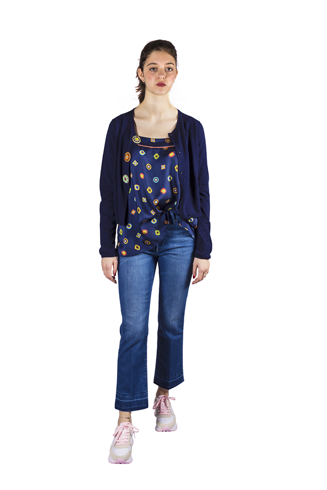 Jeans cropped denim blu a vita alta e orlo aperto.