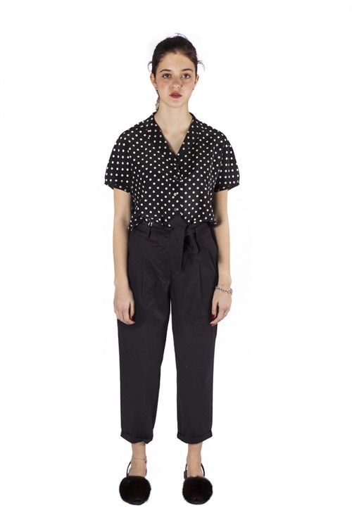Pantaloni cropped in cotone blu scuro dalla linea morbida con chiusura in vita a fiocco e tasche laterali.