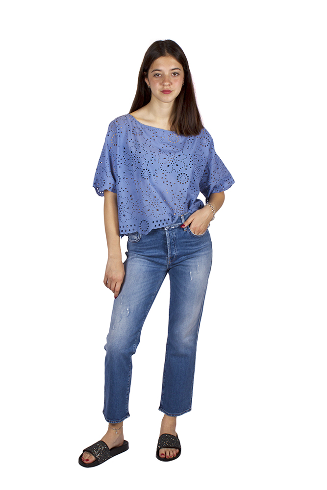 Jeans a vita alta a gamba dritta fino alle caviglie. Chiusura classica con bottone e zip.