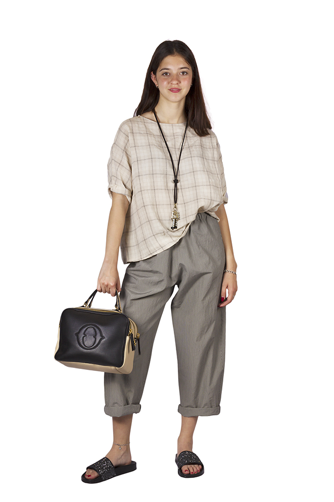 Pantalone in elastico in vita beige a gamba larga color grigio.